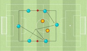La particolarità dell’esercitazione sta nella possibilità di attaccare lo spazio libero nell’altro quadrato, generando continui interscambi. Quando un giocatore riconosce spazio libero nel settore opposto, può muoversi attaccandolo, obbligando la struttura a riorganizzarsi per mantenere sempre una situazione di 4v2 nel quadrato di riferimento.