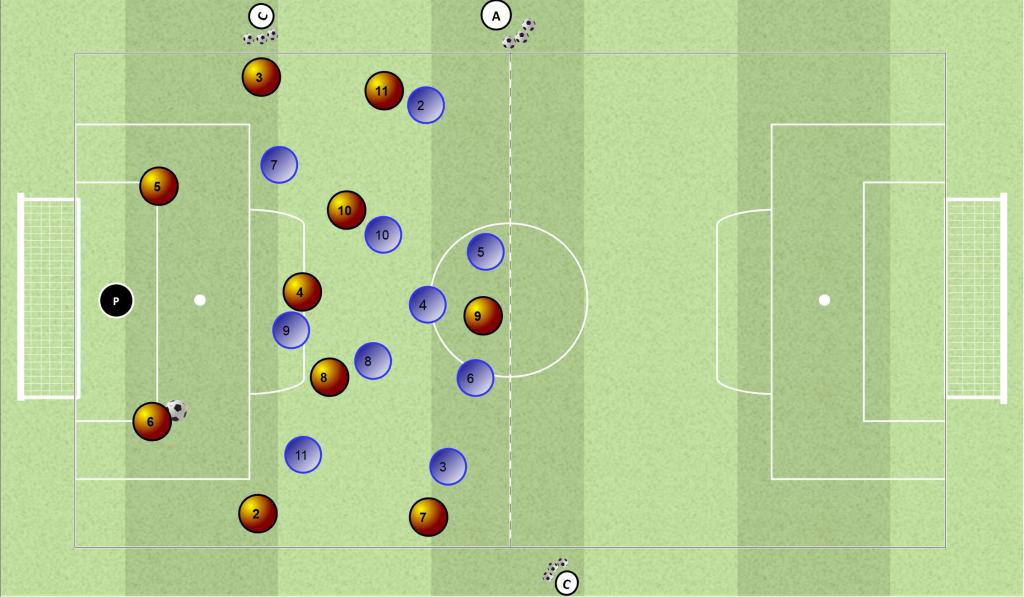 L’obiettivo principale di questa partita è allenare la squadra a uscire dalla pressione avversaria e a sfruttare i primi secondi di superiorità per finalizzare in modo rapido ed efficace. L’accento è sulla gestione della palla e sulla decisione tempestiva durante la fase di transizione.