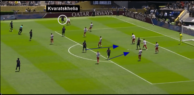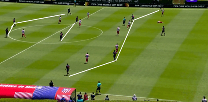 Lo sviluppo del Paris Saint-Germain avviene prevalentemente per vie laterali, creando problemi alla retroguardia degli avversari (in questo caso l’Atletico Madrid), grazie alla velocità dei propri giocatori, ovvero Hakimi e Kvaratskhelia.