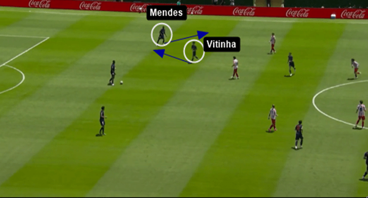 In questa fase si vedono molti scambi di posizione tra i giocatori; uno su tutti è il movimento che esegue Vitinha, il quale molto spesso si abbassa sulla linea dei due difensori centrali per far avanzare il suo compagno Nuno Mendes.
