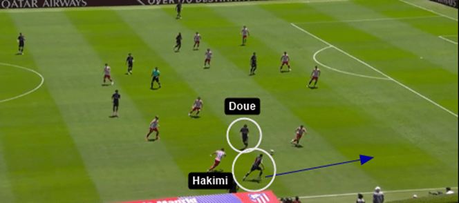La corsia preferita dagli uomini di Luis Enrique è la destra, anche perché Hakimi è sostenuto da due giocatori molto tecnici del calibro di Neves e Doué. Essi sono due giocatori che lo aiutano sempre, soprattutto in fase difensiva.