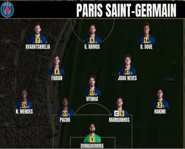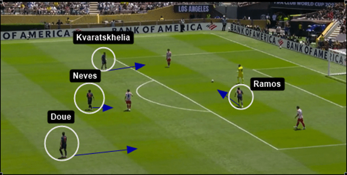 Per quanto riguarda il terzino destro (Hakimi), avanza la propria posizione sulla linea di metà campo, formando alle spalle dell’attaccante centrale (Gonçalo Ramos) una linea a 4, insieme alla mezz’ala destra (João Neves), all’esterno sinistro d’attacco (Kvaratskhelia) e all’esterno destro d’attacco (Doué).