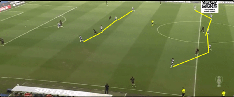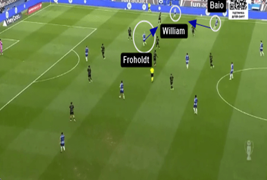 I due difensori centrali, quando Varela è impossibilitato a ricevere palla, passano la palla alle due mezze ali (Veiga e Froholdt), i quali si dimostrano molto bravi ad abbassarsi e a farsi trovare sempre pronti quando i compagni si trovano in difficoltà. Questi movimenti non solo aiutano a mantenere il possesso, ma anche a creare spazi in fase di costruzione del gioco, rendendo la manovra più fluida e dinamica. In alcuni casi, il portiere non passa la palla ai due centrali, ma decide di fare un passaggio diretto ai due terzini. Questo lo fa per velocizzare la manovra e creare una situazione di superiorità numerica, favorendo così un’immediata avanzata verso l’attacco e sfruttando l’ampiezza del campo per allargare la difesa avversaria.