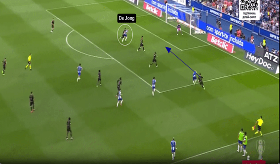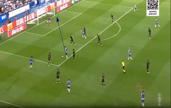 L’azione del porto ha inizio dal portiere (Diogo Costa) che, con molta sicurezza e precisione, passa la palla ad uno dei due difensori centrali (Bednarek e Perez). Questi due hanno molte opzioni di passaggio per proseguire l’azione, e ogni decisione è cruciale per lo sviluppo del gioco. Le opzioni sono due: andare per zone più “esterne” occupate dai due terzini (Sanusi e Alberto Boia), che sono pronti a ricevere la palla e ad attaccare le fasce, o andare per via centrale, dove si trova il centrocampista centrale (Varela), il quale, con la sua visione di gioco, può orchestrare al meglio le giocate e cercare spazi tra le linee avversarie per creare occasioni da gol. La scelta tra queste due possibilità dipende non solo dalla posizione attuale dei giocatori, ma anche dalla lettura del gioco e dalla strategia adottata dall’allenatore in quel momento specifico.