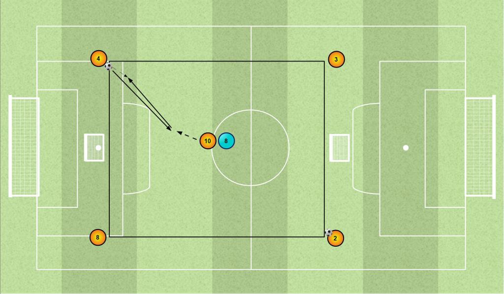 L’esercitazione inizia con il giocatore posizionato lateralmente che serve palla al giocatore centrale. Quest’ultimo si muove incontro, accorciando la distanza e offrendo una linea di passaggio chiara.