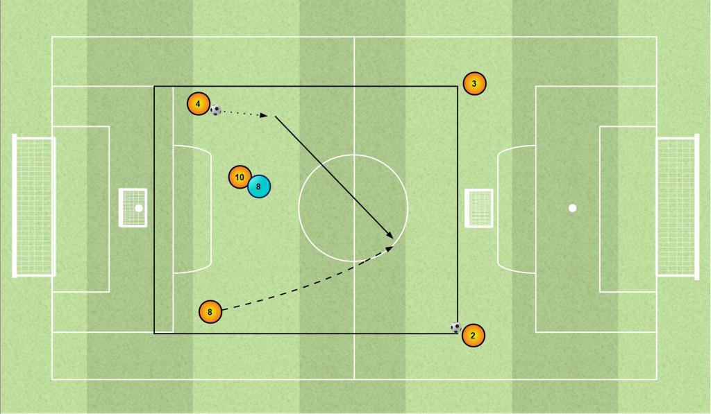 Il giocatore laterale, ricevuto lo scarico, avanza in conduzione verso l’interno per attirare l’attenzione difensiva e, nel momento corretto, effettua un passaggio diagonale verso il giocatore posizionato sul lato opposto.