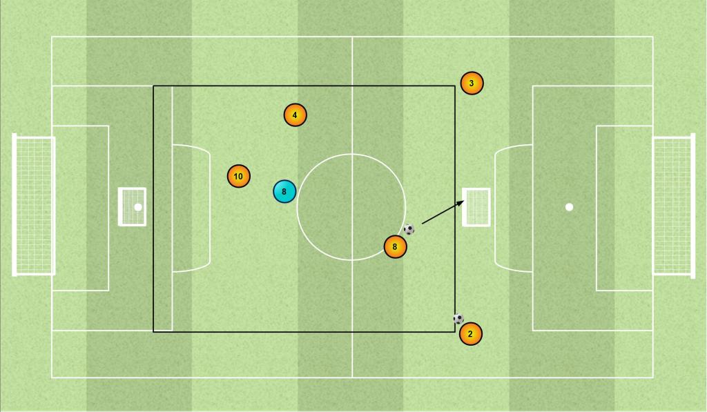 Sviluppare la capacità di creare e sfruttare il vantaggio offensivo attraverso il movimento incontro del giocatore centrale, la qualità dello scarico e il corretto tempo di inserimento del terzo uomo, migliorando coordinazione collettiva, lettura degli spazi e continuità dell’azione in zona di rifinitura.