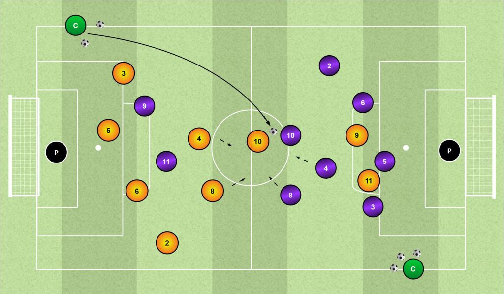 Ogni azione parte da una palla alta o lunga lanciata dall’allenatore verso una zona del campo (centrale o laterale).