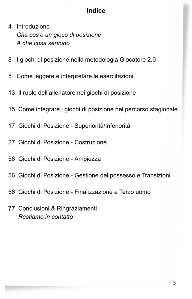 Un manuale completo dedicato al gioco di posizione nella visione Giocatore 2.0: dalla teoria alla pratica sul campo, passando per lettura, interpretazione e ruolo dell’allenatore all’interno delle esercitazioni. Il libro propone 30 esercitazioni pronte all’uso, divise per temi allenanti come superiorità/inferiorità, costruzione, gestione del possesso, ampiezza, finalizzazione e transizione.